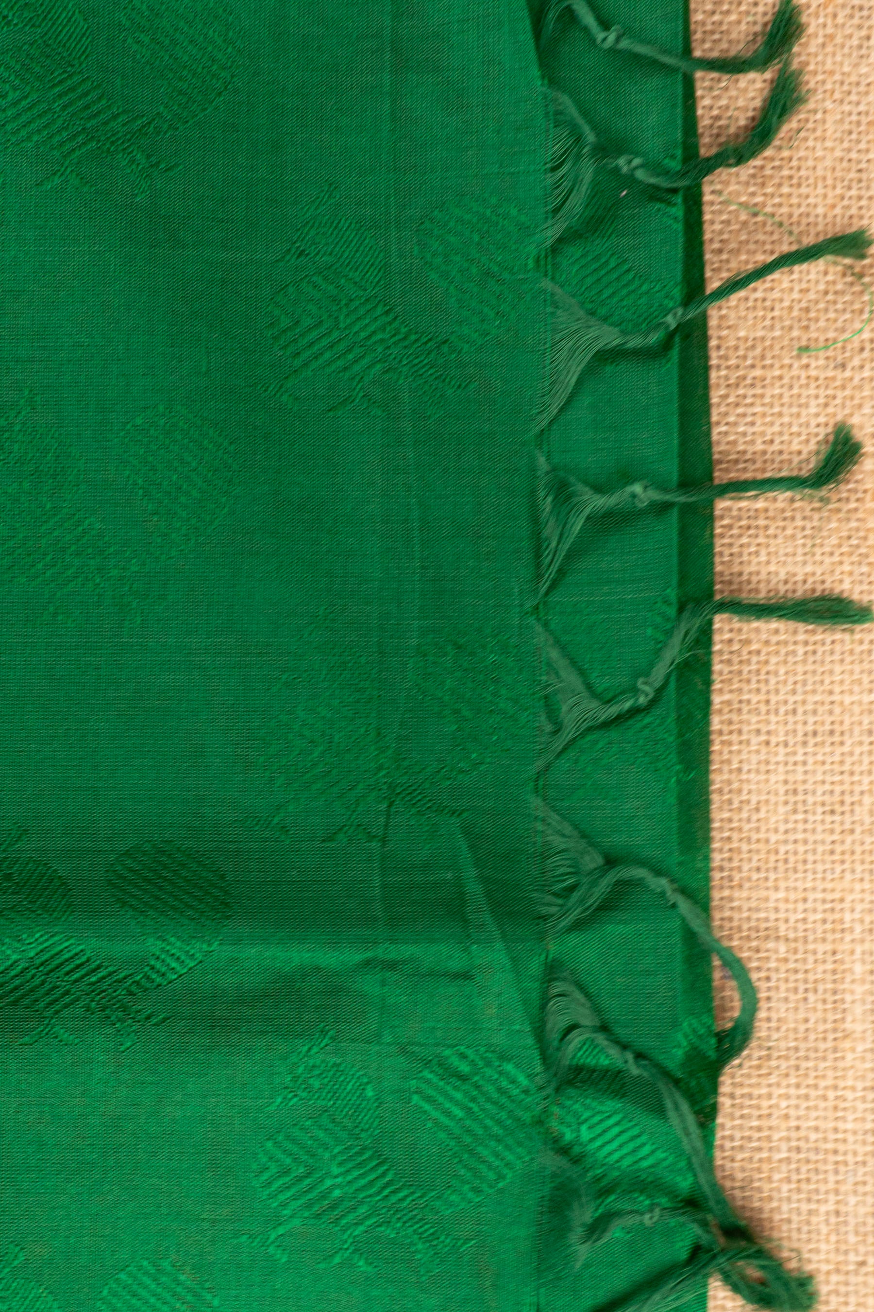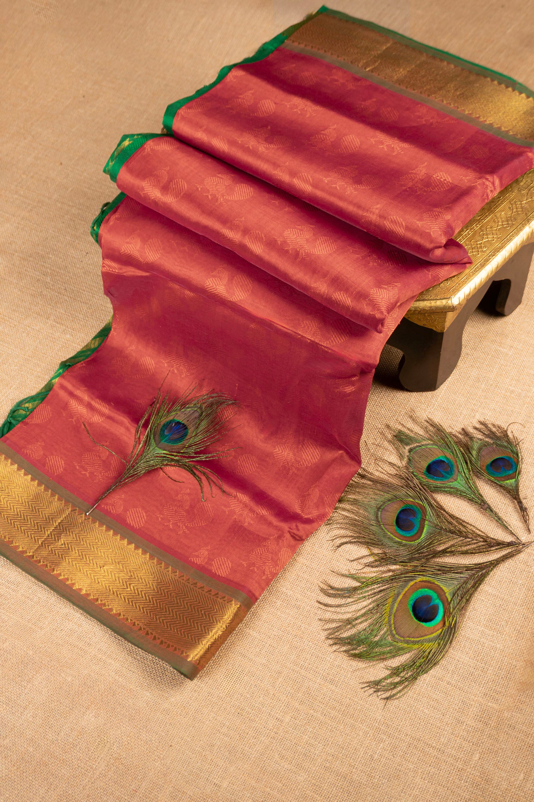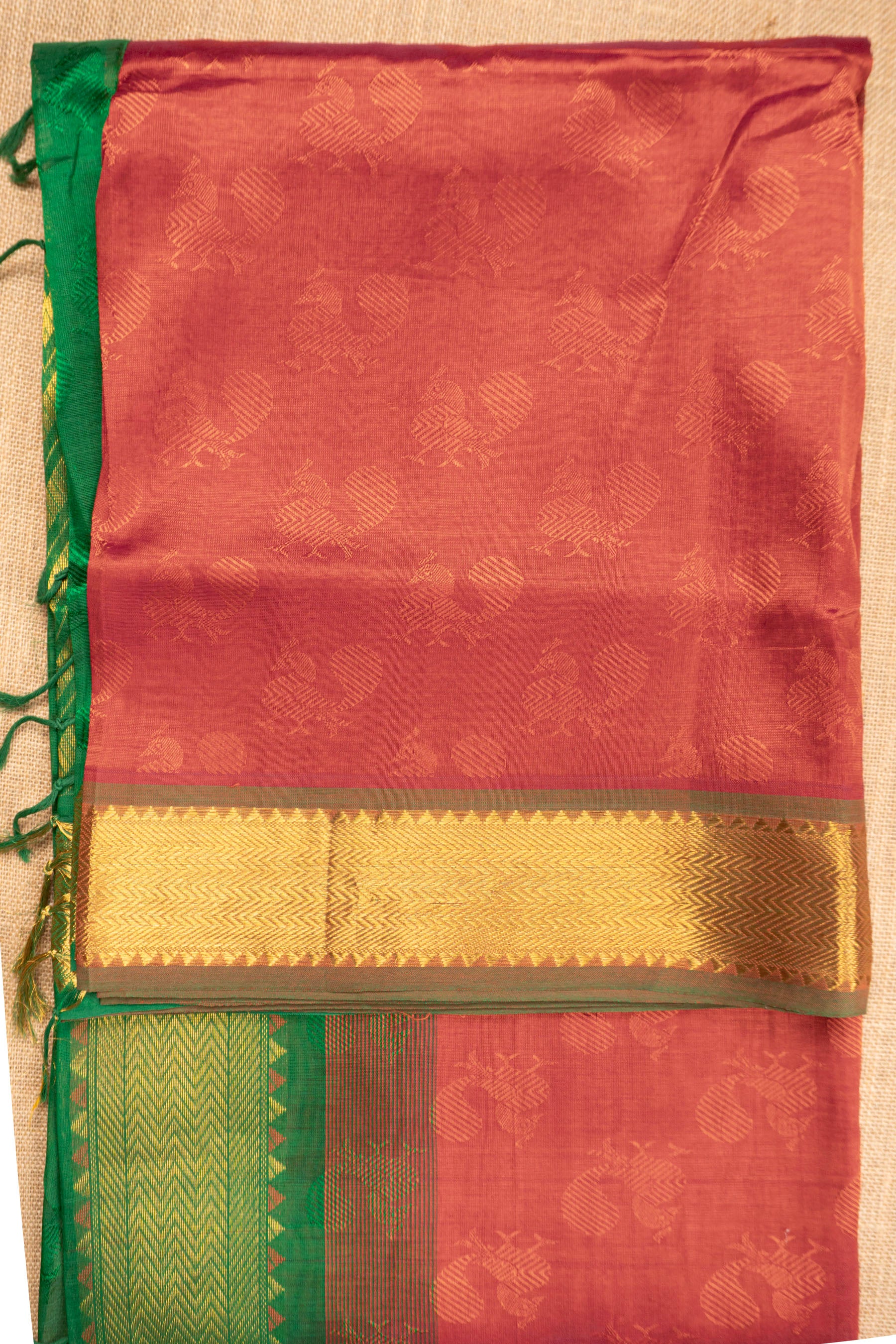 This striking cotton silk saree features a vibrant coral vermillion body that radiates warmth and energy while maintaining a sophisticated silken luster. The fabric is beautifully embellished with detailed peacock buttas woven across the length of the saree to bring a traditional artistic element to the modern color palette. A bold emerald green border provides a dramatic contrast and is highlighted by a shimmering gold zari band decorated with a precise chevron pattern and classic temple motifs along the inner edge. The design is finished with a magnificent green pallu that is entirely covered in a rich gold zari chevron weave and accented with hand-knotted green tassels for a polished and festive look. Combining the breathable comfort of cotton with the elegant drape of silk this saree is an excellent choice for weddings and grand celebrations where you want to stand out with both color and craftsmanship.