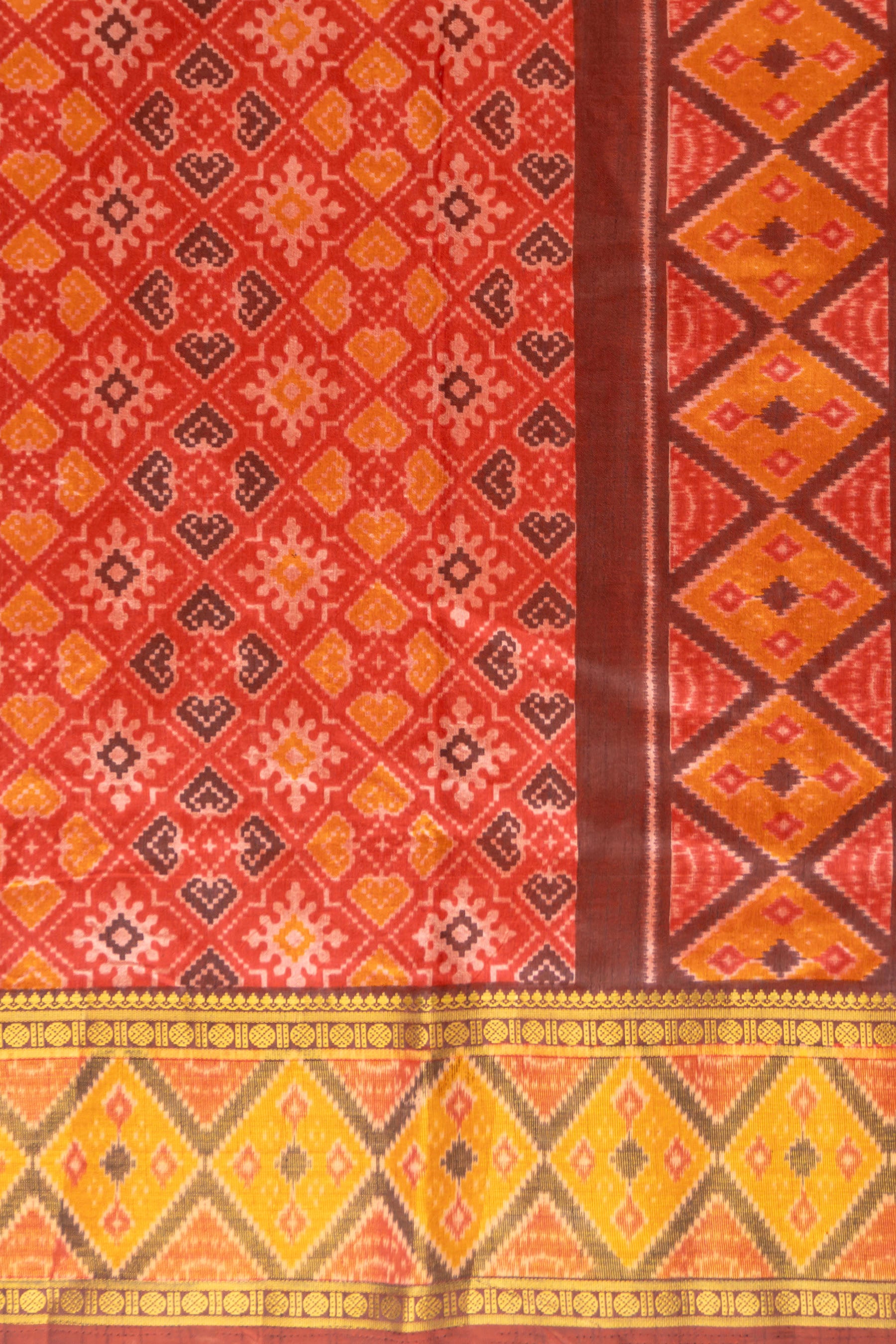 This vibrant saree is a high-quality Art Silk imitation of the traditional Patola silk double-ikat weave, providing the intricate geometric patterns and striking colours in a comfortable and easy-to-care-for fabric. The main body of the saree is a beautiful Radiant Red (vermilion/coral red) base, densely decorated with repeating Ikat-style diamond and floral motifs in shades of yellow, orange, and darker red. The saree features a highly contrasting vertical panel (likely the pallu) in a deep Mahogany/Dark Brown, which contains large, dramatic diamond ikat patterns in yellow and orange. The design is finished with a striking, broad border featuring large yellow and orange diamond motifs and a narrow, traditional gold zari edging, beautifully showcasing the intricate artistry of Patola prints.