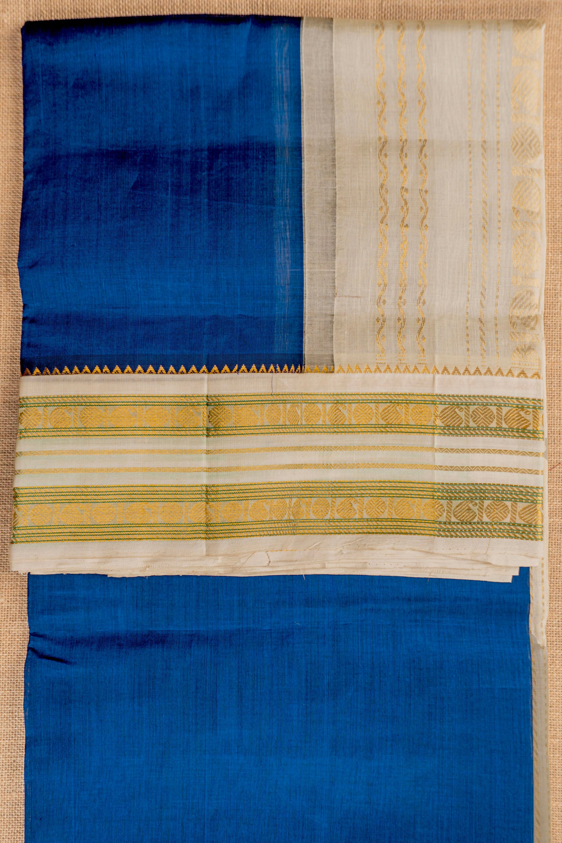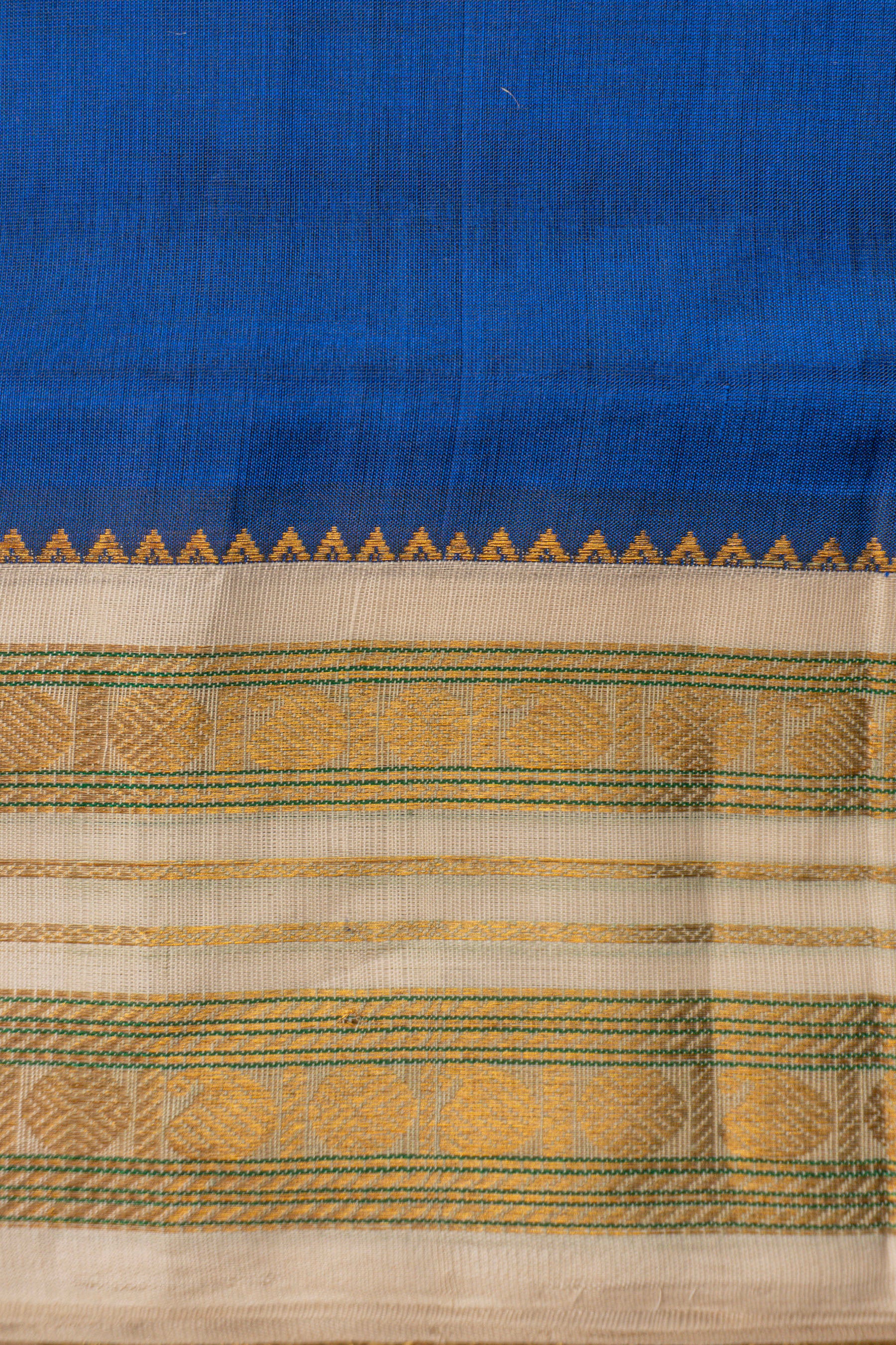 This exquisite handwoven saree features a vibrant royal blue body that radiates elegance and sophistication. Crafted from a premium silk cotton blend, the fabric offers a subtle sheen and a lightweight, breathable drape suitable for all-day wear. The saree is beautifully contrasted by a pristine cream border and pallu, which are intricately detailed with traditional golden zari work. A distinctive golden temple pattern, known as the gopuram design, creates a sharp and rhythmic transition between the blue body and the cream border. The wide borders and the rich pallu showcase detailed horizontal zari stripes and geometric motifs, finished with delicate hand-knotted tassels. Perfect for festive celebrations, religious ceremonies, or formal occasions, this saree seamlessly blends traditional craftsmanship with a modern color palette.