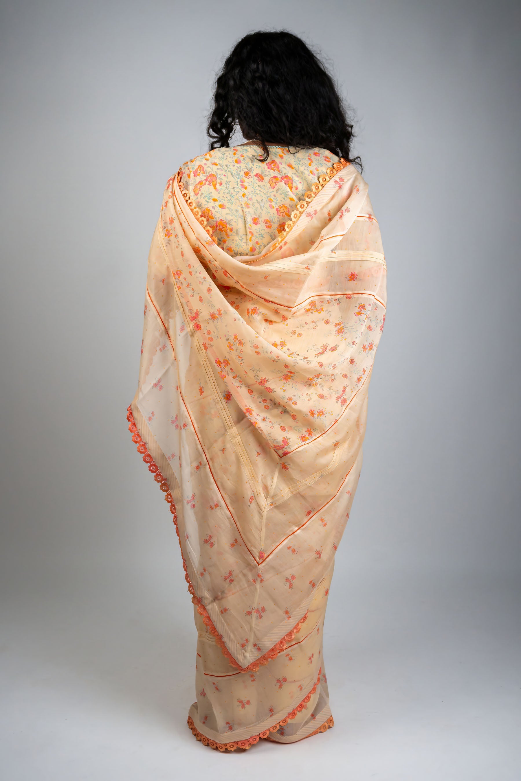 Embody whimsical grace in this beautiful Pale Blue Chanderi Saree, a stunning blend of soft pastels and striking detail. The saree's lightweight, sheer body is adorned with delicate pink and peach floral prints, complemented by scattered petite motifs for a fresh, romantic aesthetic. Adding a playful contrast, the pallu and border feature a vibrant pattern of pink and white stripes, framed by an intricate, contrasting pink lace trim. This enchanting saree drapes beautifully and is an ideal choice for sophisticated daytime events, festive occasions, or summer celebrations. Note: This saree is available on made to order basis, and will take 20- 30 working days.