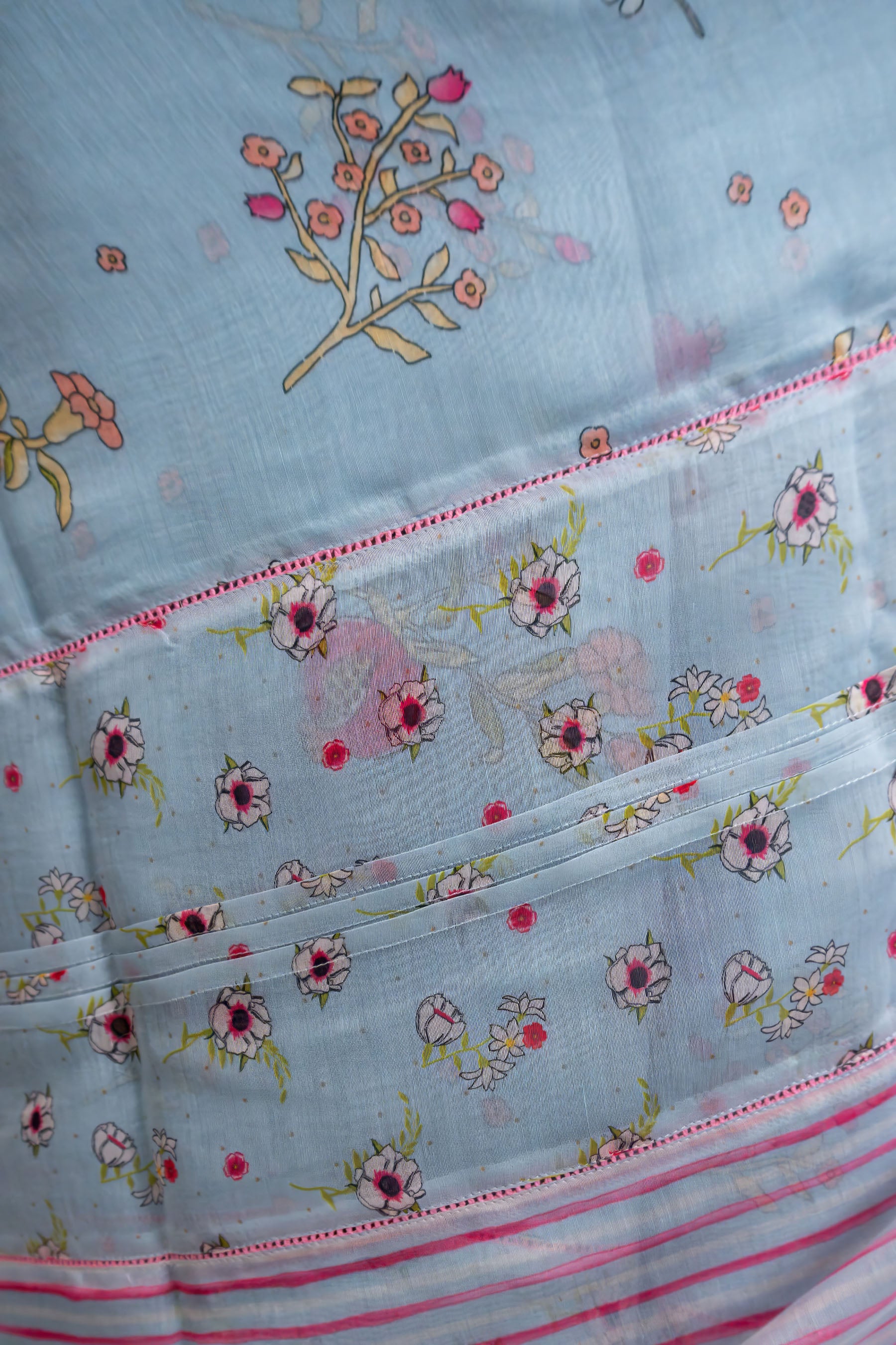 Embody whimsical grace in this beautiful Pale Blue Chanderi Saree, a stunning blend of soft pastels and striking detail. The saree's lightweight, sheer body is adorned with delicate pink and peach floral prints, complemented by scattered petite motifs for a fresh, romantic aesthetic. Adding a playful contrast, the pallu and border feature a vibrant pattern of pink and white stripes, framed by an intricate, contrasting pink lace trim. This enchanting saree drapes beautifully and is an ideal choice for sophisticated daytime events, festive occasions, or summer celebrations. Note: This saree is available on made to order basis, and will take 20- 30 working days.